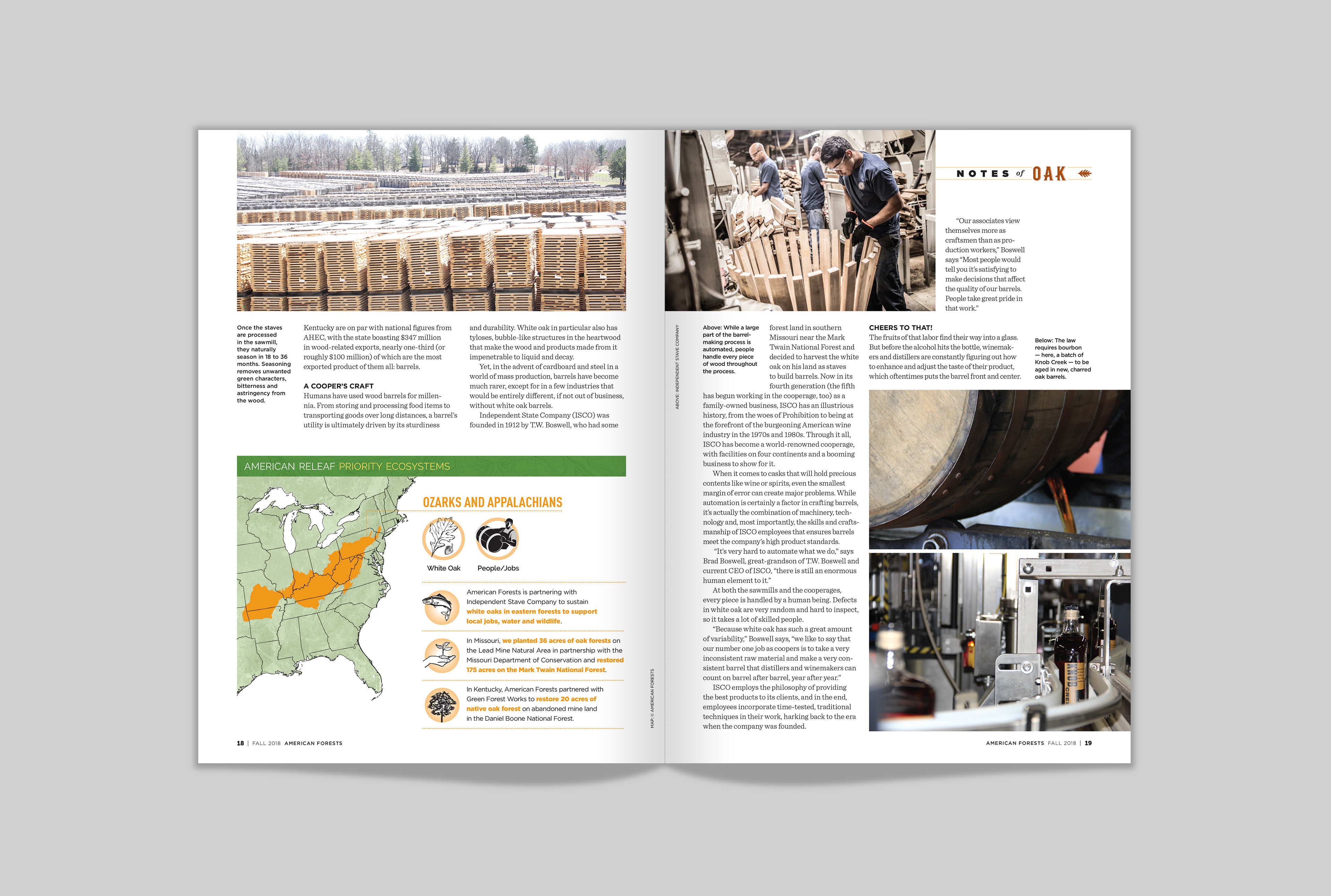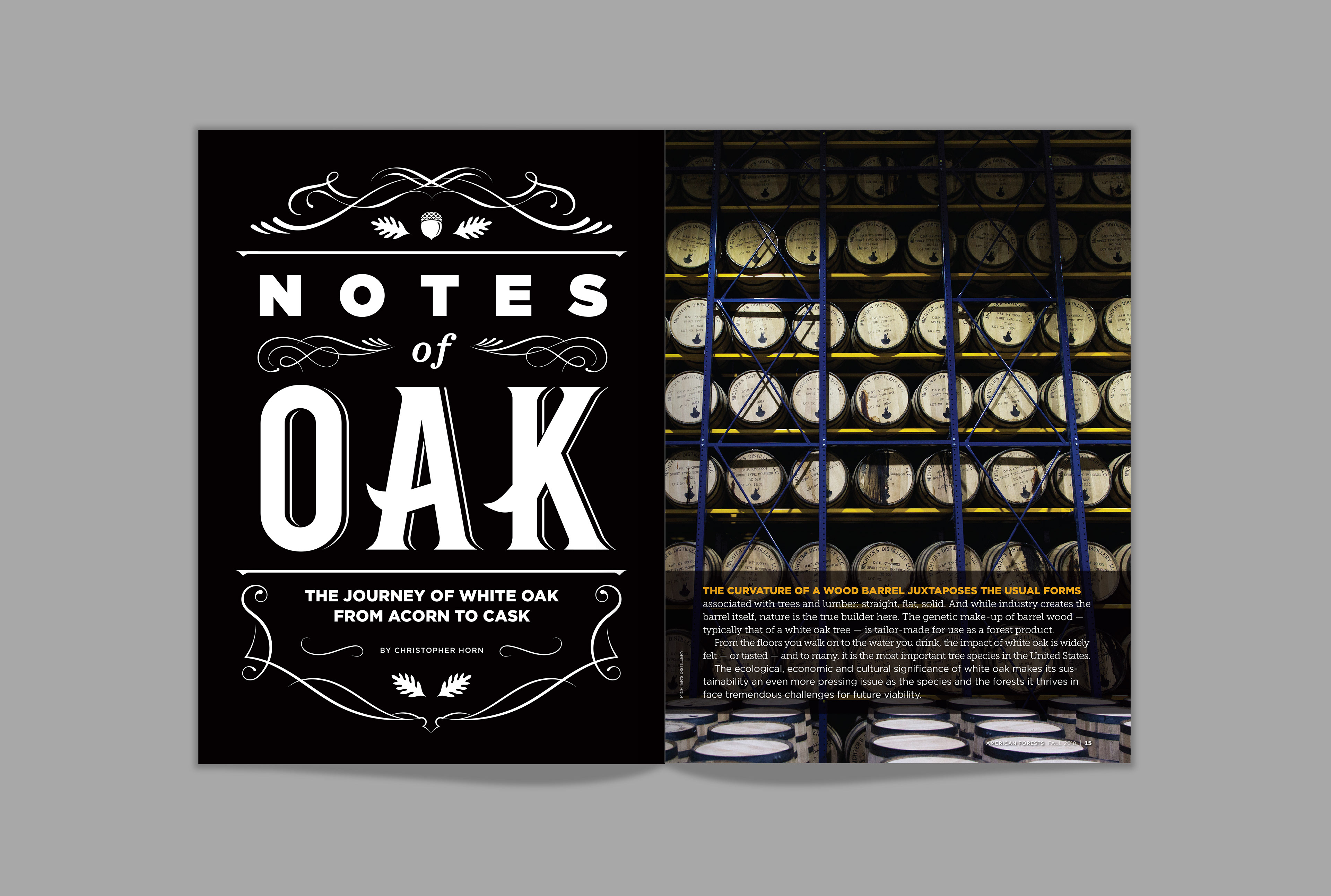 Creative direction, layout and typographic illustration, “Notes of Oak” feature, Fall 2018 issue